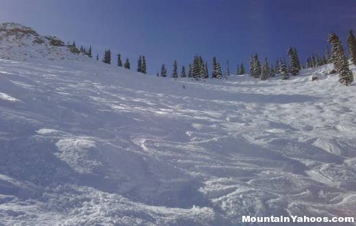 Runs: "Peak" and "Banana Funnel" - Not a clear day but what is clear is that the chutes off of the "Peak" are steep!