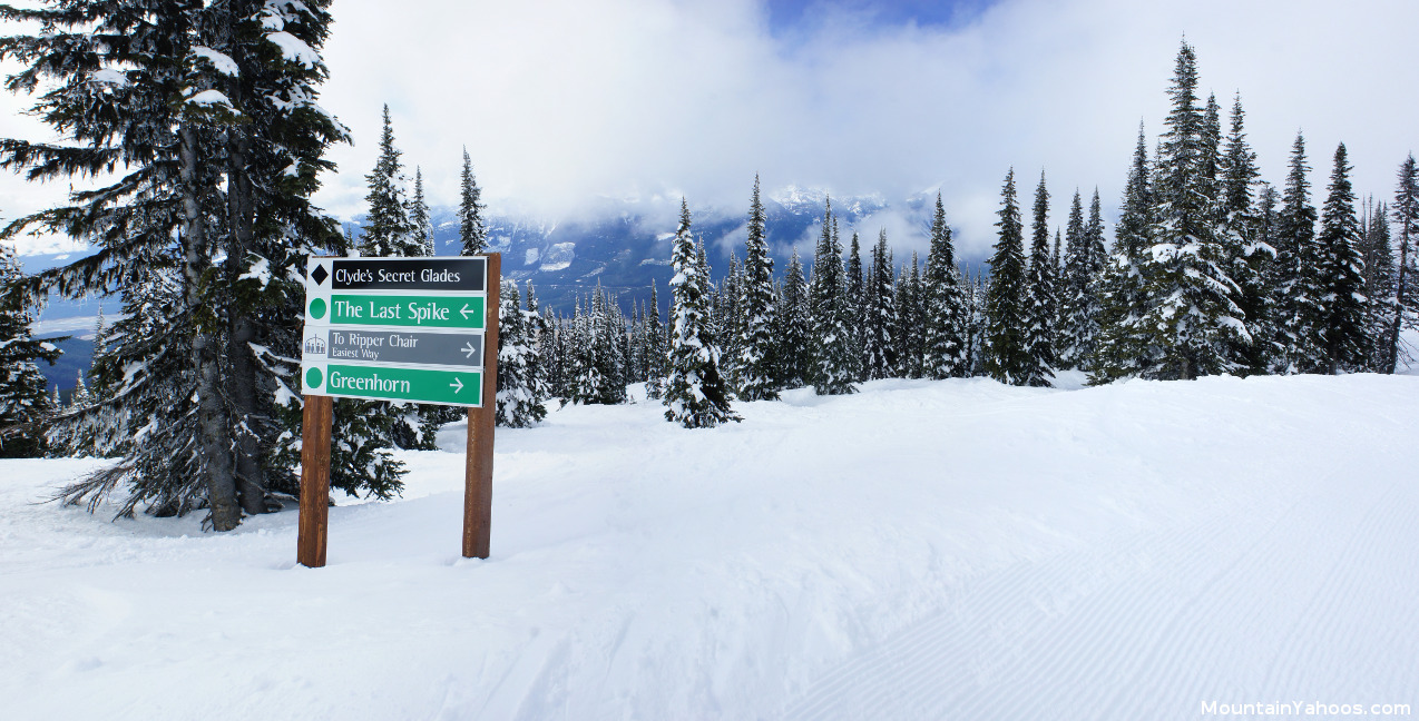 Revelstoke is kind to the novice if and only if they stay at the lower part of the mountain and never venture past the first stop on the Revelation gondola or ride the magic carpet lift. These runs are well marked and are groomed nightly and well maintained. The longest trail on the mountain is the green run "The Last Spike" which is over nine miles long running the length of two lifts, the "Revelation" gondola and upper "Stoke" chair lift. The run returns you back to the base of the lift making the journey predictable. The intermediate "blue" runs are scattered around the mountain. All lifts on the front side have at least a "green" beginner run down the mountain, returning you to the base but these are typically narrow cat walk trails with merging runs and skiers traveling at high speeds. They are not suited to beginners learning to ski but more for connecting trails or for tired skiers returning to the base at the end of the day.