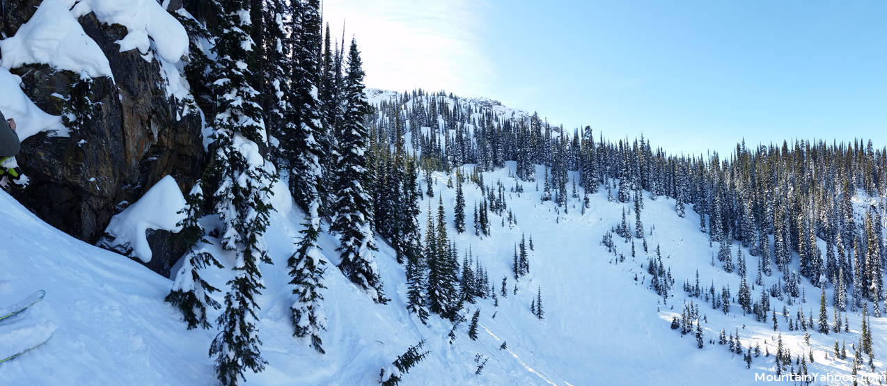 Revelstoke has a single peak (Mt. Mackenzie) which segregates the terrain into two upper bowls: North (backside) and South bowl (resort front-side). South Bowl of course gets more sunlight often changing the snow consistency from light powder to a more compact snow while North Bowl retains the powder and is home to more advanced terrain. Revelstoke patrol seeks to mark all cliffs and obstacles but given its vast size, this is an impossible task. Thus we would like to issue a warning to all who ski here, pay attention to the terrain. There are a lot of cliffs of all sizes. This warning becomes more emphatic for those in the trees where there are more marking omissions. It's almost as if Revelstoke has added a new level to the ranking of runs: green, blue, black, double black and orange (cliffs).