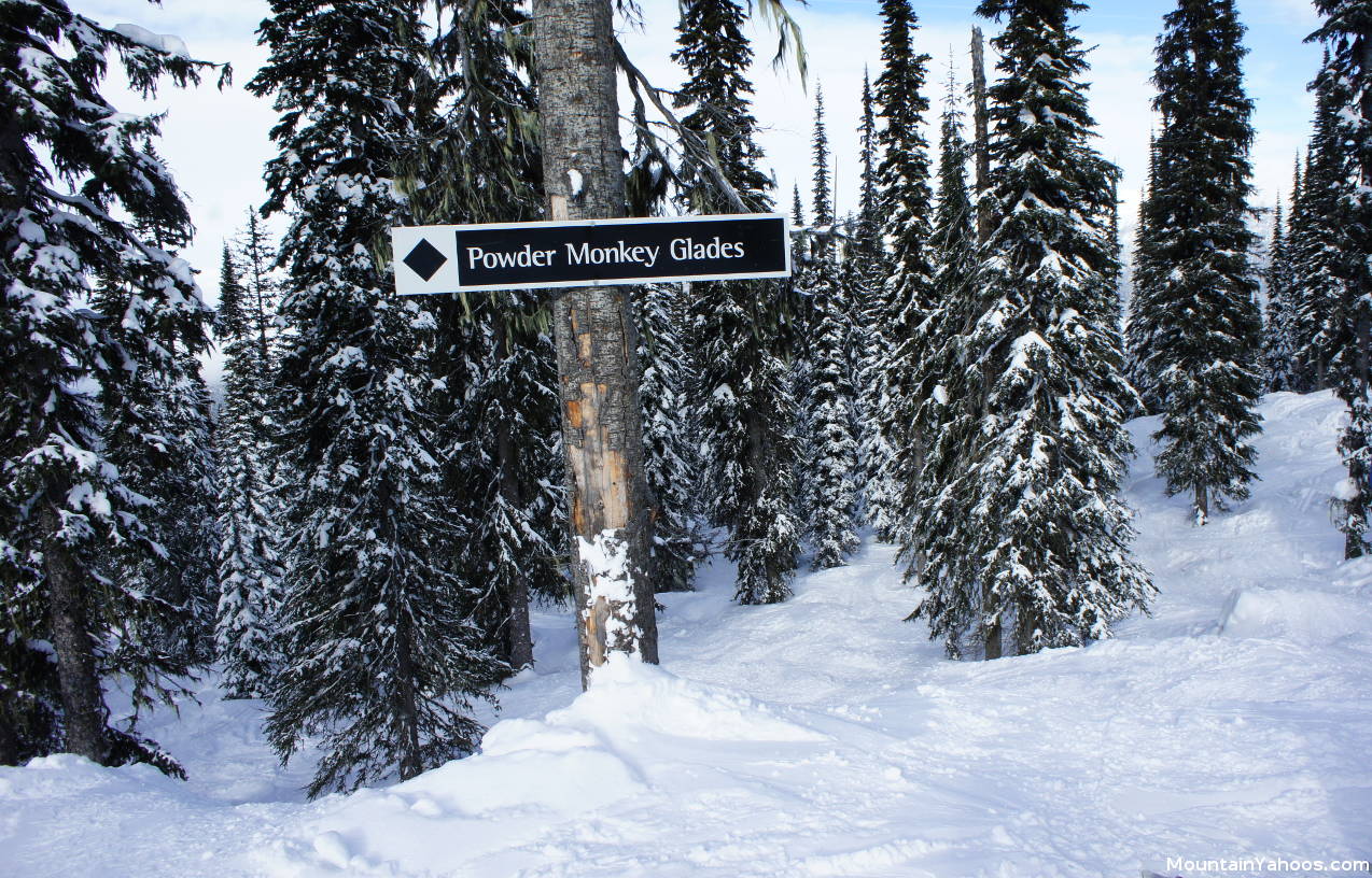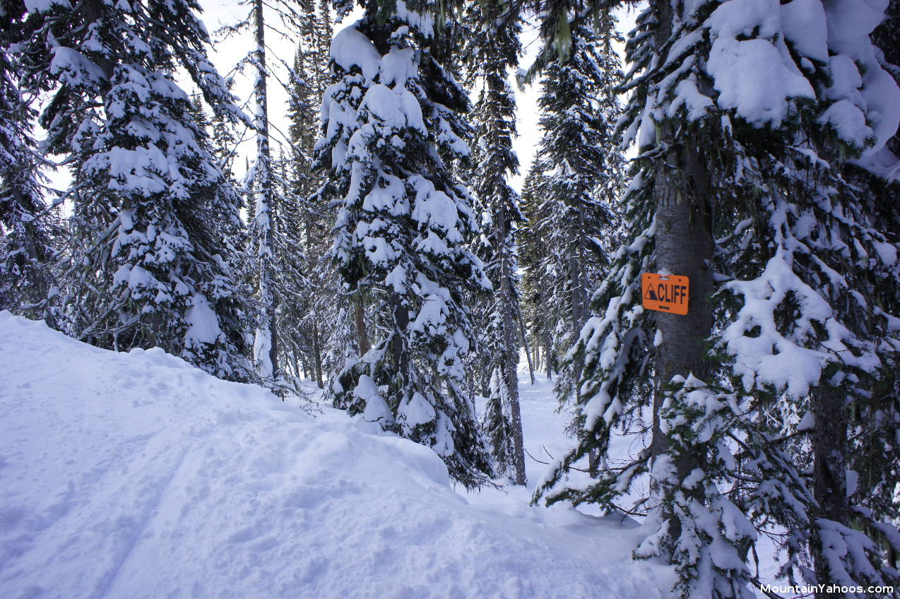 Powder Monkey Glades tree run: pay attention to warning signs. Warning: not all cliffs are marked