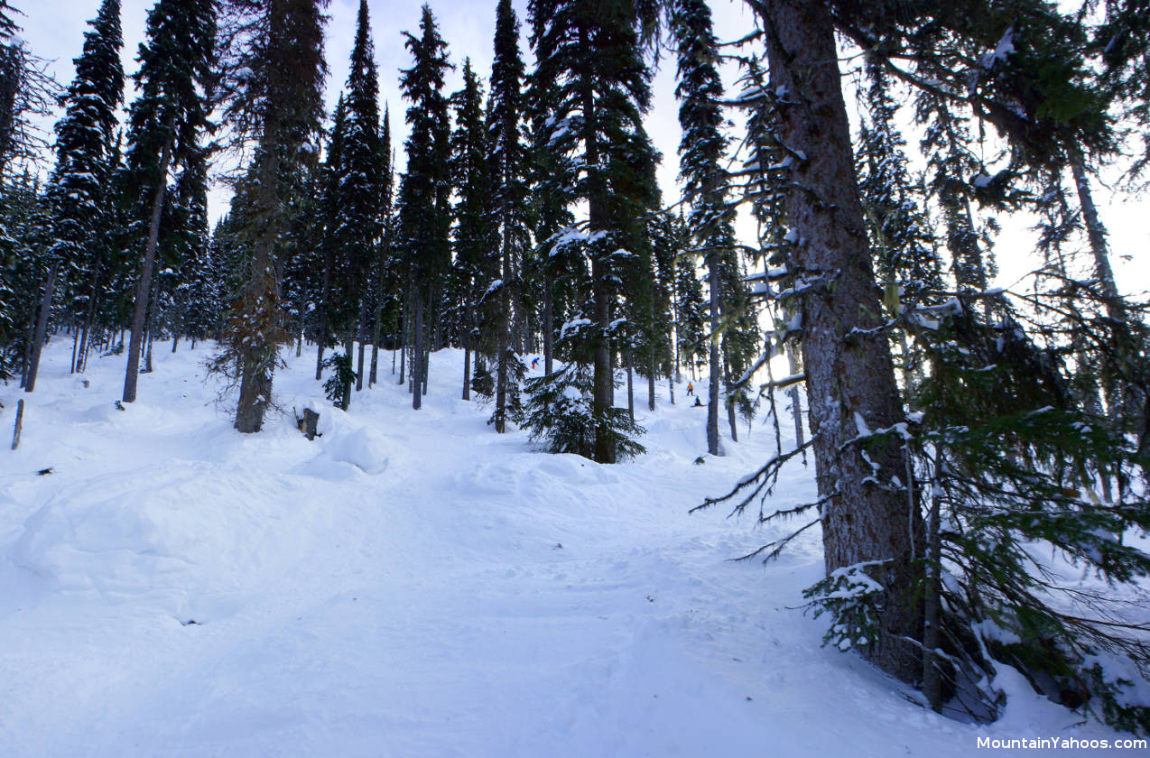 Revelstoke has 16 named gladed areas. You will find "Aspen Glades" and "Tasty Glades" to be more spacious and forgiving. "Powder Monkey Glades" and "Clyde's Secret" are steeper. Many of the run-outs and returns of runs and bowls will lead you to a tree run as the only option. Only "Beauty Glades" featured surprisingly difficult forced options unless you consider hucking cliffs an option (some do and there are tracks to prove it). It is best that one be comfortable with tree runs if skiing Revelstoke. The tree spacing is generally generous. Our favorite are "Tally-Ho Glades" and "Stihl Life Glades" along side of "The Stoke" lift.