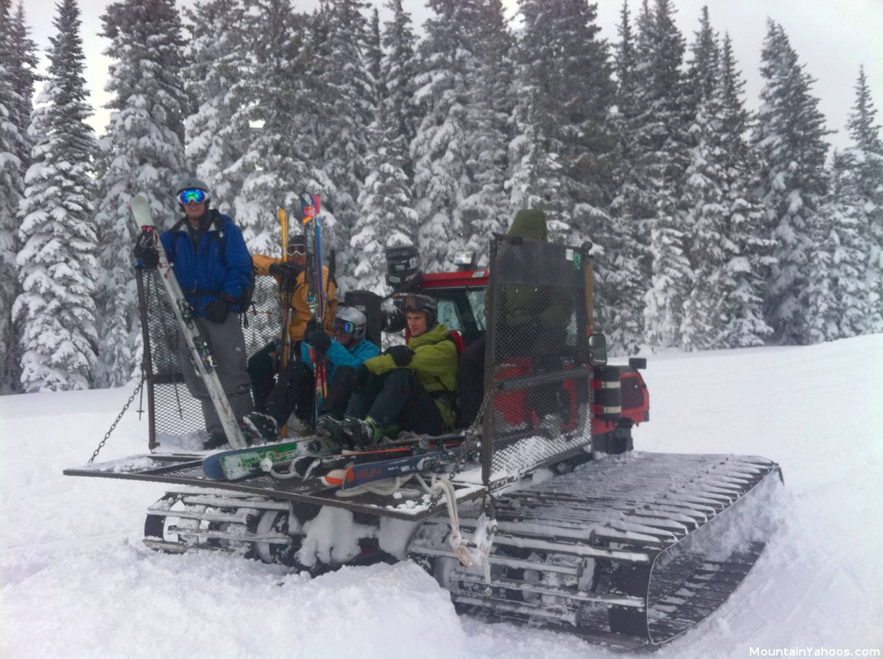 The snowcat ride is free and is picked up at the bottom of the saddle of the ridge-line between the peak of Alberta Lift and Horseshoe Bowl.